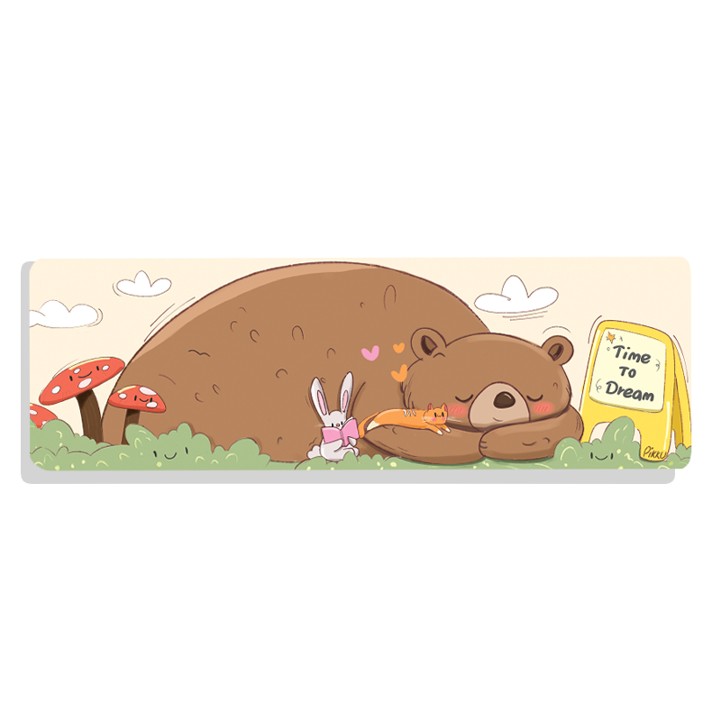 خرس قهوه ای، خرگوش کتاب خوان، گربه خنگ نارنجی، در یک دشتی سرسبز ، با قارچ های قرمز و تابلوی time to dream، همه در زمینه کرم روشن با ابرهای سفید پراکنده، یک صحنه خیالی شاد ایجاد می‌کنند. اگر کتاب‌خوان هستید یا به دنبال هدیه‌ای منحصربه‌فرد برای دوستان کتاب‌دوست، این محصول با رنگ‌های نود، سبز، نارنجی و زرد و صورتی، تجربه خواندن را لذت‌بخش‌تر می‌کند.